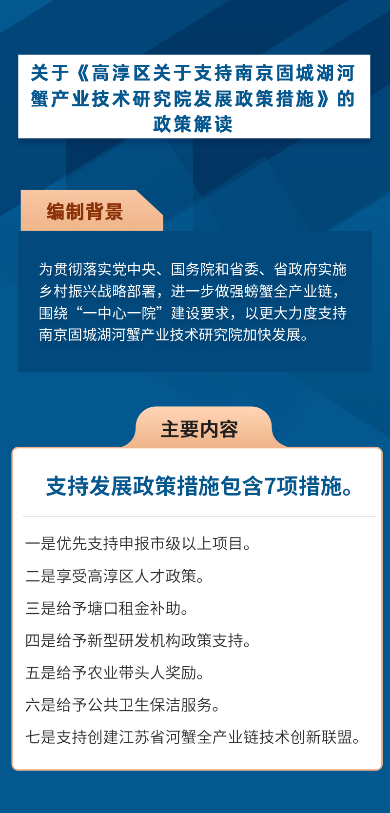 關(guān)于《高淳區(qū)關(guān)于支持南京固城湖河蟹產(chǎn)業(yè)技術(shù)研究院發(fā)展政策措施》的圖解