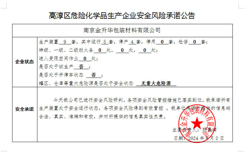 | 信息名稱: | 高淳區危險化學品生產企業安全風險承諾公告 |