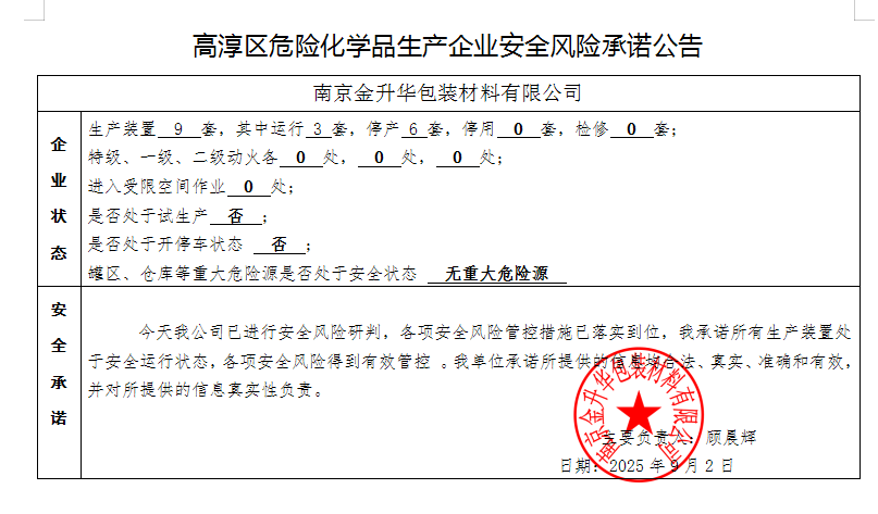 | 信息名稱: | 高淳區危險化學品生產企業安全風險承諾公告 |
