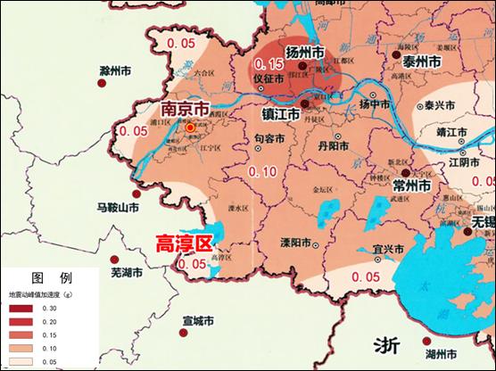 高淳區處于茅山斷裂帶的南端,該區域于1974年、1979年分別發生了溧陽5.5級、溧陽6.0級兩次破壞性地震。根據《南京市活斷層探測與地震危險性評價》項目研究結果,南京市轄區內具備發生6級地震的構造背景。根據中國地震動參數區劃圖(GB 18306-2015)規定,高淳區淳溪街道、古柏街道、陽江鎮、磚墻鎮屬于抗震設防烈度六度地區,漆橋街道、固城街道、東壩街道、椏溪街道屬于抗震設防烈度七度地區。(詳見圖1高淳地震動峰值加速度區劃圖)